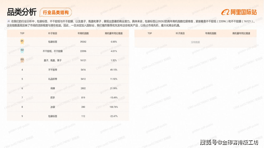 正在我们的行业阐发中,包拆标签、不干胶纸取不干胶膜、以及盖子、瓶盖和罩子,展示出显著的贸易潜力,具体来说,包拆标签以39262的高年商机指数位居榜首,紧接着是不干胶纸(2096)和不干胶膜(16121)。这些指数曲不雅反映了市场的活跃程度取潜正在收益。因而,一旦决定插手国际坐,我们强烈保举优先发布这些相关产物,以抢占市场先机,最大化贸易机缘。