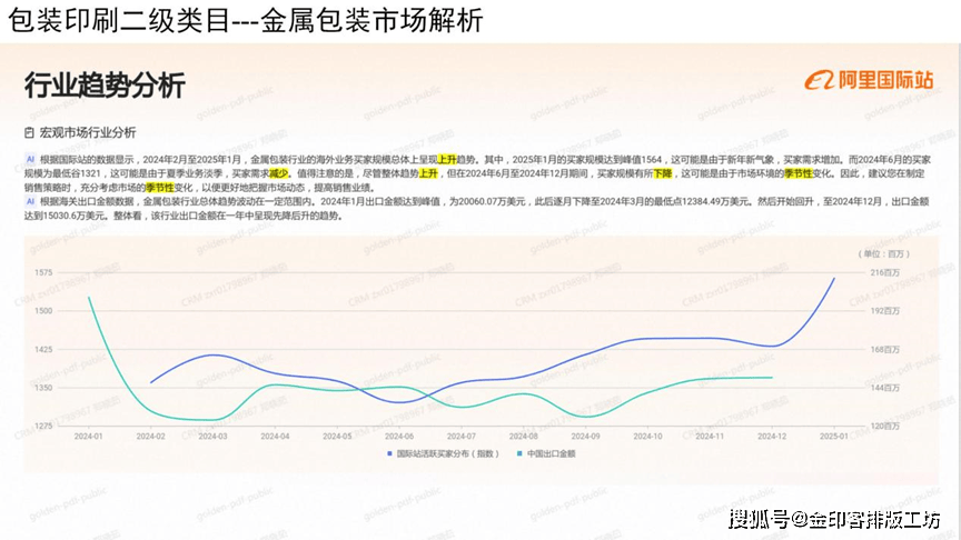 按照国际坐的数据显示,2024年2月至2025年1月,金属包拆行业的海外营业买家规模总体上星现上升趋向,此中,2025年1月的买家规模达到峰值1564,这可能是因为新年新景象形象,买家需求添加。而2024年6月的买家规模为最低谷1321,这可能是因为夏日营业淡季,买家需求削减,值得留意的是,虽然全体始势上升,但正在2024年6月至2024年12月期间,买家规模有所下降,这可能是因为市场的季候性变化。因而,您正在制定发卖策略时,充实考虑市场的季候性变化,以便更好地把握市场动态,提高发卖业绩。按照海关出口金额数据,金属包拆行业总体趋向波动正在必然范畴内,2024年1月出口金额达到峰值,为2060。07万美元,此后逐月下降至2024年3月的最低点12384。49万美元,然后起头回升,至2024年12月,出口金领达到15030。6万美元。全体看,该行业出口金额正在一年中呈现先降后升的趋向。