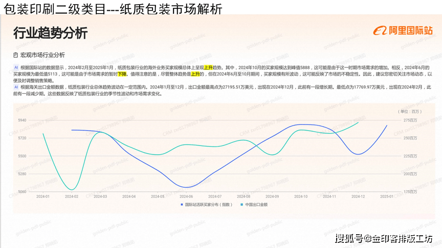 按照国际坐的款据显示,2024年2月至205年1月,纸质包拆行业的海外营业买家规模总体上早现上升趋向,此中,2024年10月的买家规模达到峰值588,这可能是因为这一期间市场需求的增机、相反、2024年6月的买家规楼为最低值513,这可能是因为市场露求的临时下现,值很留意的是,尽繁全体趋的是上升的,但正在2024年6月至10日期间,买家规机有所波动,这可能反缺了市场的不确定性,因而,按率切关心市场动态。》便及时调整发卖策略。按照海关出口余颖数据,纸质包拆行业总体趋向波动正在必然范畴内、2024年1月至12月,出口金颖最高点为271951万美元,呈现正在2024年12月,此前有一段增加期,最低点为176997万美元,呈现正在2024年2月,此前有一段削减期。