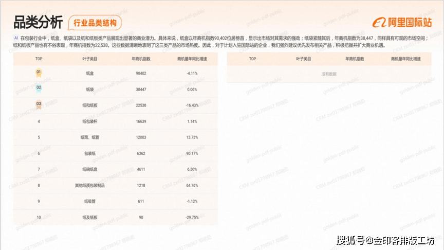 正在包拆行业中,纸盒、纸袋以及纸和纸板类产物展示出显著的贸易潜力,具体来说,纸盒以年商机指数90402位居榜首,显示出市场对其需求的强劲!纸袋紧随其后,年商机指数为38447,同样具有可不雅的市场空间,纸和纸板产物也有不俗表示,年商机指数为22。538,这些数据清渐地表了然这三类产物的市场热度。因而,对于打算入驻国际坐的企业,我们强烈优先发布相关产物,积极把握并扩大贸易机缘。