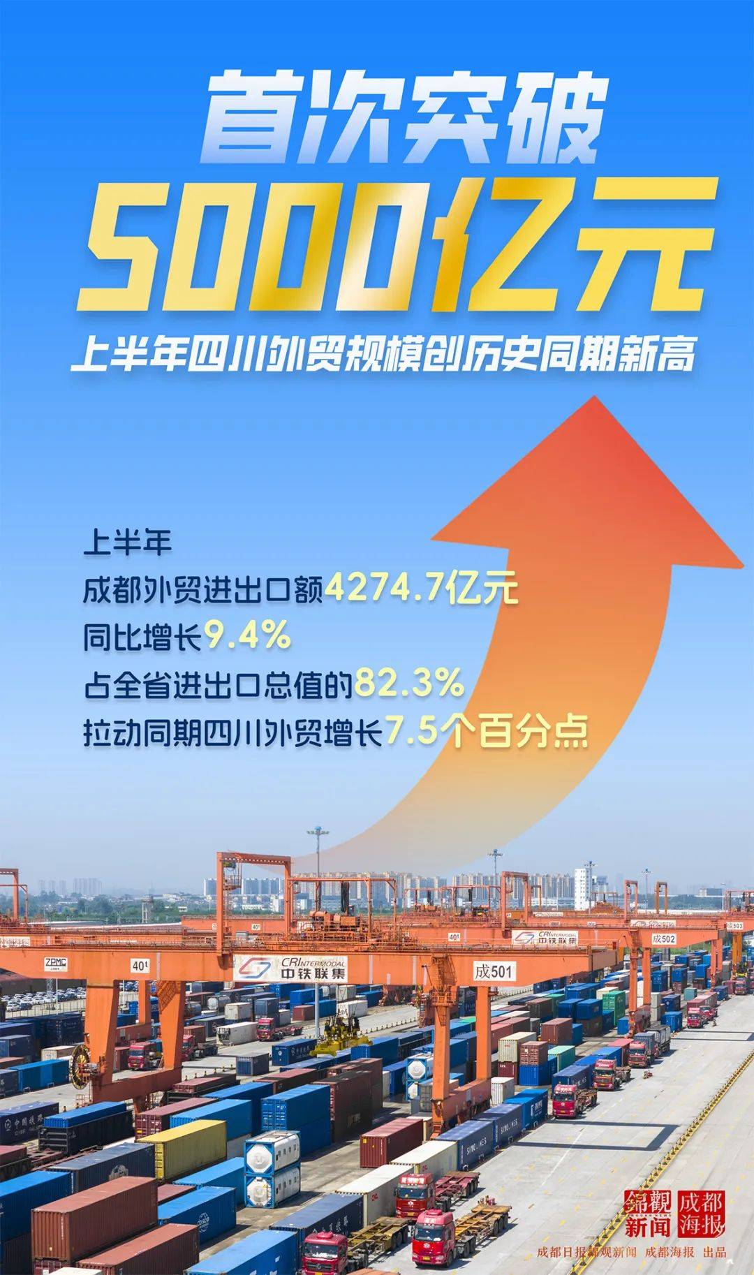 年上半年,四川外贸进出口5190。9亿元,初次正在汗青同期冲破5000亿元,规模位列全国第8,同比增加6。3%。此中,成都完成进出口额4274。7亿元,初次正在汗青同期冲破4000亿元,规模创下汗青同期新高,同比增加9。4%,占全省进出口总值的82。3%,拉动同期四川外贸增加7。5个百分点。